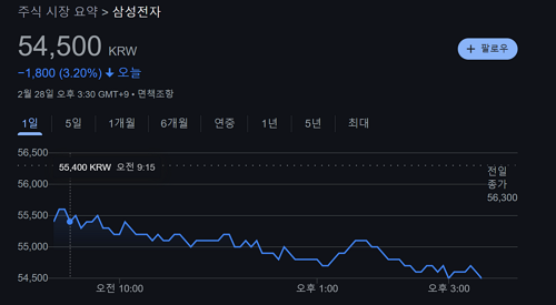 - 주가 정보: 2025년 2월 28일 기준 삼성전자의 종가는 54,500원이었습니다.